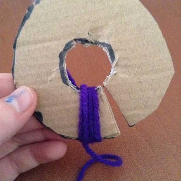 Ahora con su cartón junto y las aberturas están en el mismo lado. Mantenga una pequeña cola de hilo entre los dedos y empezar a envolver el hilo alrededor de la cartulina, cuando ha envuelto que alrededor de 5 veces puede dejar ir de su cola y no debe moverse mientras envuelve. Comience envolviendo y moviéndose hacia el otro extremo de la cartulina, o como se muestra en las fotos anteriores.