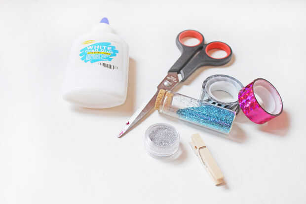Usted necesitará un pegamento, tijeras, tipo differend de brillo, cinta de colores, clips de madera y esmalte tal vez.