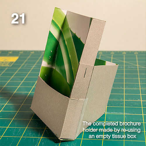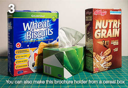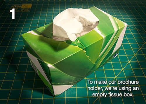 Aquí le mostramos cómo puede reciclar una caja de pañuelos vacía en un sostenedor del folleto adecuado para mostrar folletos DL o triple y el precio no podría ser mejor, es gratis. Usted está siendo demasiado amable con el medio ambiente, la caja del tejido consigue otra vida como exhibición de productos. Por supuesto también se podría utilizar cualquier otra caja de empaquetado de vacío como los paquetes de cereales y se pueden ajustar las medidas para adaptarse a otros folletos tamaño. Para ver los subtítulos un poco más claro, zoom en el navegador web. © EZIPOP