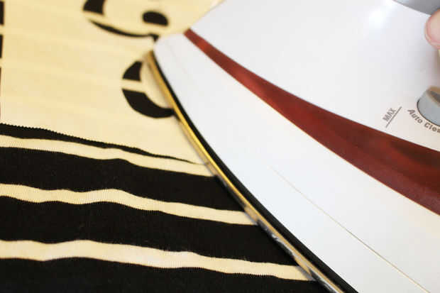 Con un ambiente cálido, seco, prensa el papel del congelador a la camisa. Colocar las piezas interiores de las letras en el lugar correcto, luego pulse ésos también. Asegúrese de presionar el congelador bien de papel para la pintura no se escaparán bajo.
