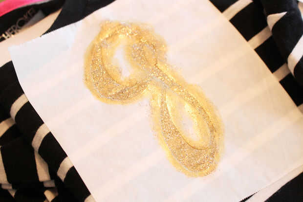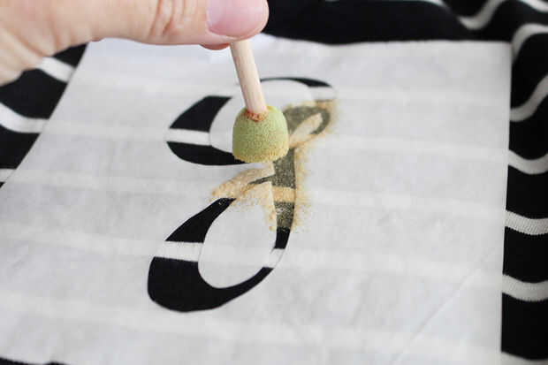 Tome su cepillo pouncer y frote suavemente sobre la pintura de tela. Como se puede ver, la pintura va en transparente, por lo que tendrá que hacer varias capas. Terminamos haciendo unas cinco capas de la pintura de oro, y dos capas del brillo de la pintura.