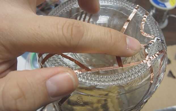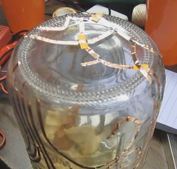 Regla sugerencia 2: A pesar de que la parte inferior de la cinta de cobre no es conductor, es una buena práctica poner un trocito de papel entre el + y - si se superponen en la jarra.