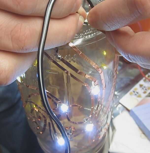 Regla/sugerencias: Las luces son muy brillantes en 5v, que está muy bien. Hacia usted brillan blanco brillante. Sin embargo, cuando se miran a través del tarro de masón, se ven ISH, como una luz de luciérnaga. Así que si quieres hacer el diseño cobre en el interior de la jarra y los LEDs indican como amarillento, usted querrá poner los LEDs en el interior de la jarra.