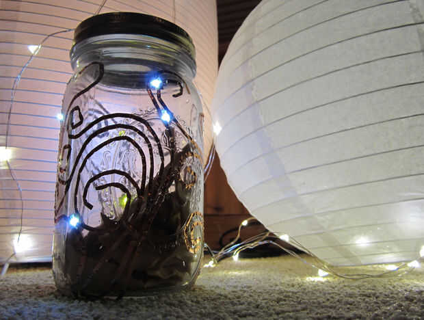 Quería hacer una luz de hadas de un tarro de masón y poner en hojas de una especie woodland-ish de sensación. Gracias a Instructables, recibió un envío de herramientas Dremel Dremel construir noche en el Hackerspace de agujero de conejo y decidió que