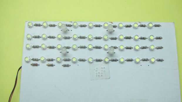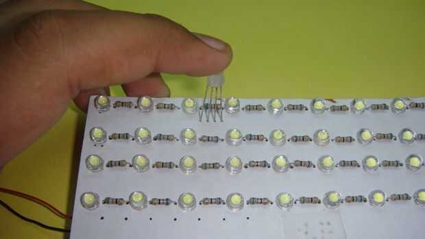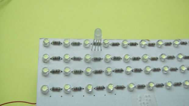 Usted debe me han dejado algo de espacio entre los leds blancos como dijo antes mi. Coloque los LED RGB en estas lagunas. No he dejado espacio para RGB led mis leds blancos están a suficiente distancia para acomodar RGB led entre. Uso sólo cuatro leds como cuatro son suficientes y dará amplias de luz. Después de colocar y soldar los leds RGB en el tablero llevado, conectan las clavijas similares de los leds. Si desea comprobar el LED y quiero ver que conducen pertenece a qué color usan una célula de 3v. Debajo de la última hilera del blanco led de la soldadura de las 3 resistencias (200 ohms, 100 ohmios, ohmios 68). La resistencia de 200 ohmios se conectará el cable correspondiente al color rojo, resistencia de 100 ohms al cable correspondiente verde color y 68 ohmios de resistencia para el plomo que corresponde al color azul. A continuación son las conexiones de la RGB led: