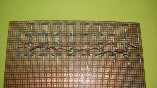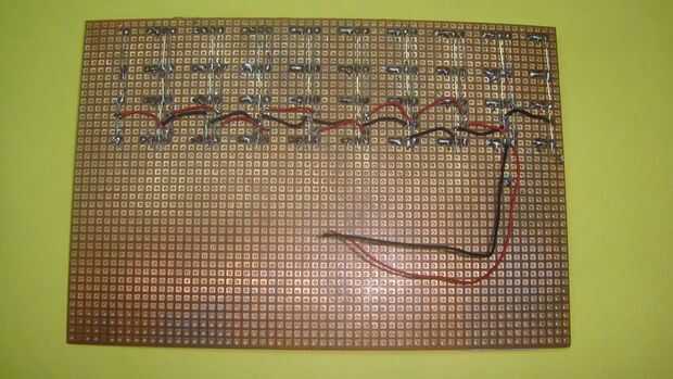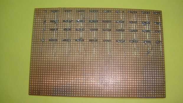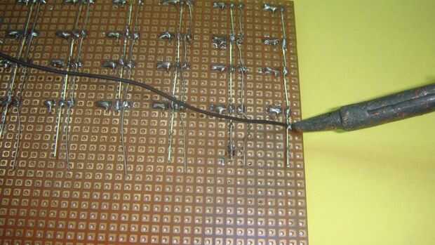 Después de que terminaste con soldadura de leds, conectar todas las filas en paralelo es decir, conectar el positivo de todas las filas juntas y negativas de todas las filas juntas. Luego soldar un cable al positivo de cualquiera de las filas que lo positivo del tablero llevado y el otro cable al negativo de cualquiera de la fila que va a ser la negativa del tablero llevado. Después de conectar las resistencias, quedarían con una resistencia de 68 ohmios. Esta resistencia se utilizarán mientras que conectando el RGB led para el tablero llevado.