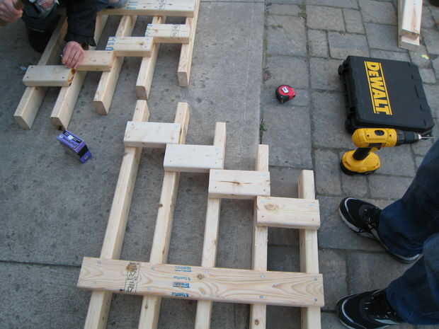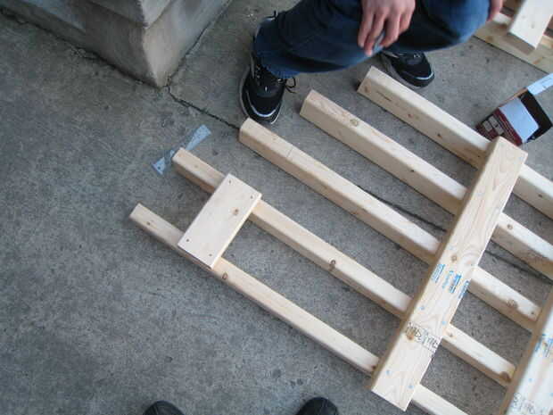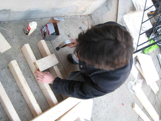 3. a partir de la pieza vertical más largo, poner pegamento debajo de la línea marcada y lugar 7.5" pieza horizontalmente debajo de la línea. Martille los clavos.