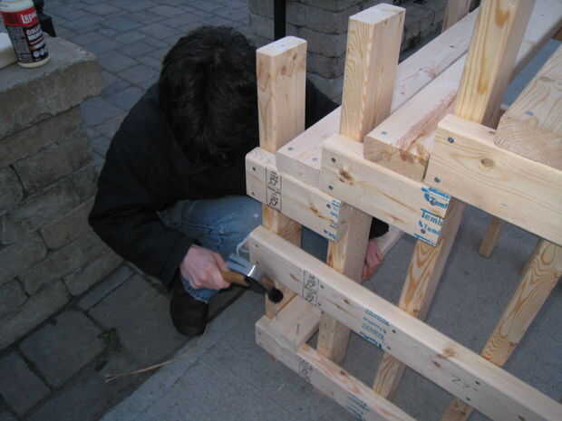 1. Coloque la madera 33" en el soporte más bajo existente en cada lado del bastidor, como se muestra en la imagen, aplicando pegamento y martilla el clavo.