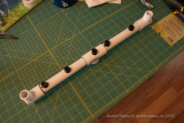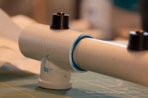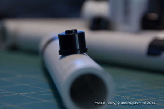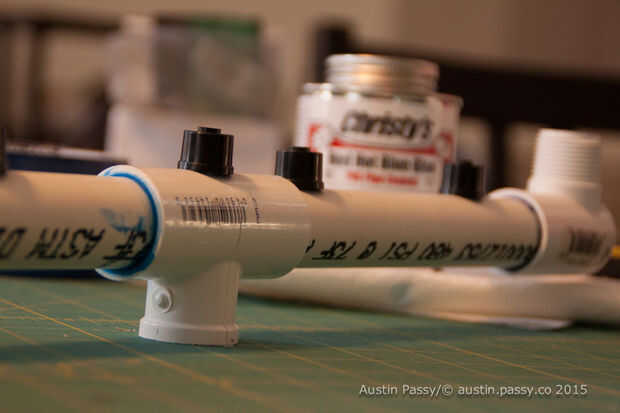 Entonces medí las guarniciones; la Unión en t fue 2¾" amplia y cada tapa 2¼ amplia. Con la resta de los totales y la anchura total y añadir ocho (por cada entrada de la guarnición) tuve mi longitud interior de PVC.