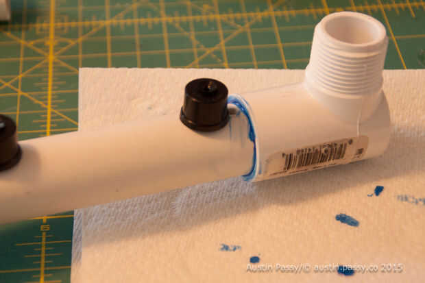 Hacer una prueba encajan con todas las piezas para asegurarse de que tiene la longitud correcta y que se ajuste bien a la cubeta. Nota: encontré que agregando alguna loción para manos a los extremos ayuda a prueba ajuste las conexiones sin ellos conseguir pegadas (yo usé algunas lociones de mini hotel tuve que poner alrededor de esto).