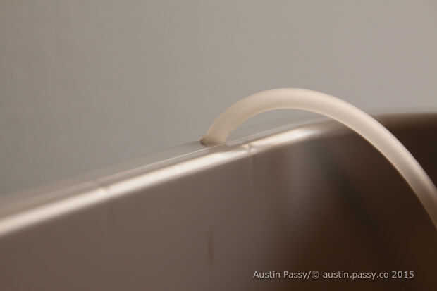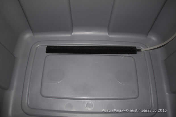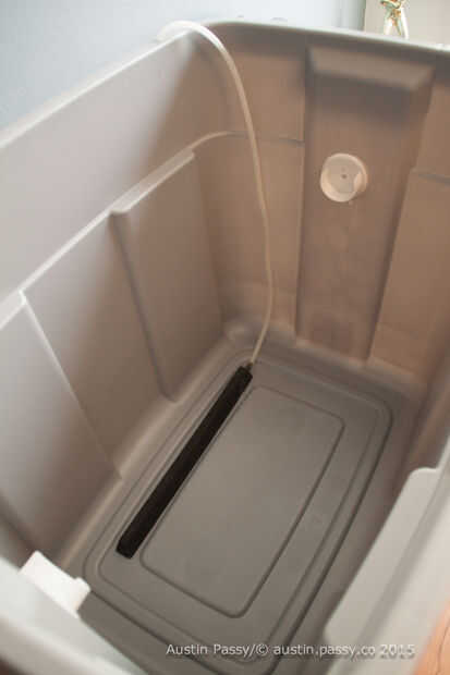 Coloque el aire-roca en la parte inferior. Decidí pegar abajo y funcionar los tubos por el lado. También perforé un agujero pequeño para recorrer los tubos en la parte superior para permitir que la parte superior del bin asentar firmemente contra la bandeja cuando cierra. Tenga en cuenta también el desmontaje de tiempo opcional en la parte superior.