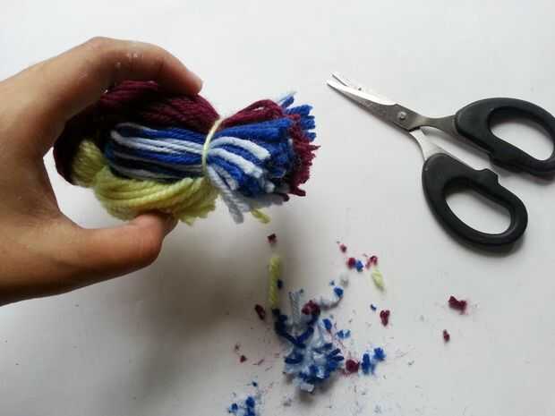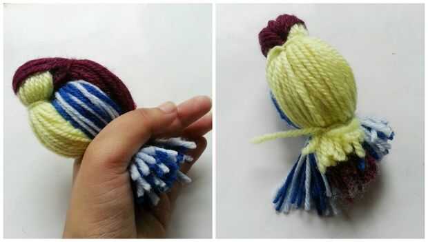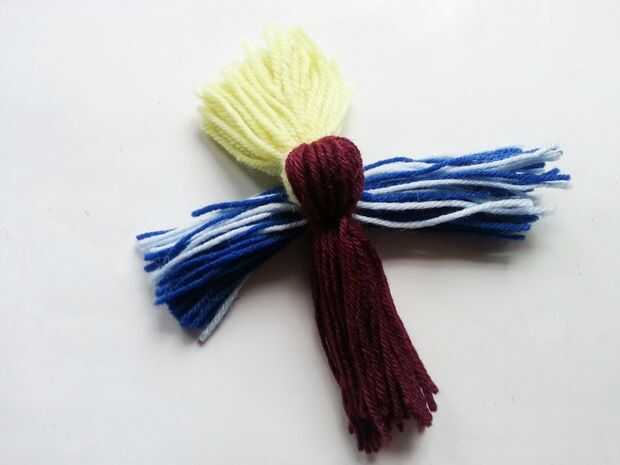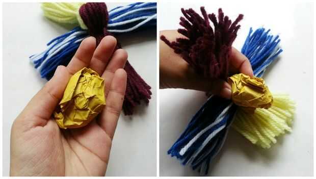 Tomar un pequeño trozo de papel (la mitad de papel de tamaño A4). Coloque el pedazo de papel y presione para hacerla pequeña. El tamaño del cuerpo de las aves depende del tamaño de papel arrugado. Coloque el papel arrugado entre los 3 grupos de hilos como se muestra en la figura 2 de este paso.