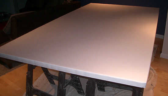 usé una alta calidad, 1/4" siesta rodillo para extender la pintura. Evitar glopping en demasiado pesado, para no saturar la guata por debajo. No cubren bien al principio, pero usted va aplicar muchas capas. Creo que hice unas cinco capas y se utiliza sólo 1/3 de un galón. Después de las primeras capas par - por el momento hay cobertura decente - me di cuenta que la hoja tenía una textura bastante áspera a pesar de los hilos de alta. Utilicé un papel de lija P220 para suavizar las cosas entre las capas restantes y la diferencia era notable. La hoja terminada, pintada se siente más como vinilo de lino.