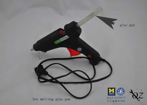 a. un arma de pegamento de fusión caliente y tres cartuchos de pistola de pegamento.
