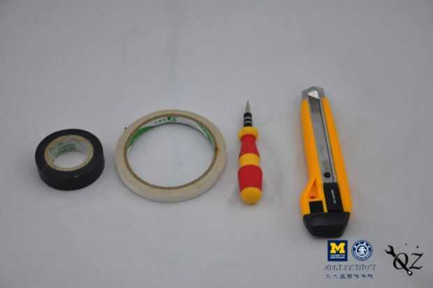 b. una cinta aislante, una cinta adhesiva de doble cara, un destornillador y un cúter.