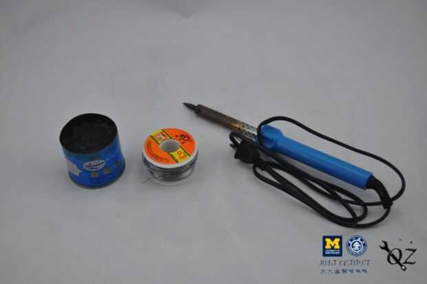 c. una plancha eléctrica, un carrete de hilo de estaño y un frasco de pasta de soldar.