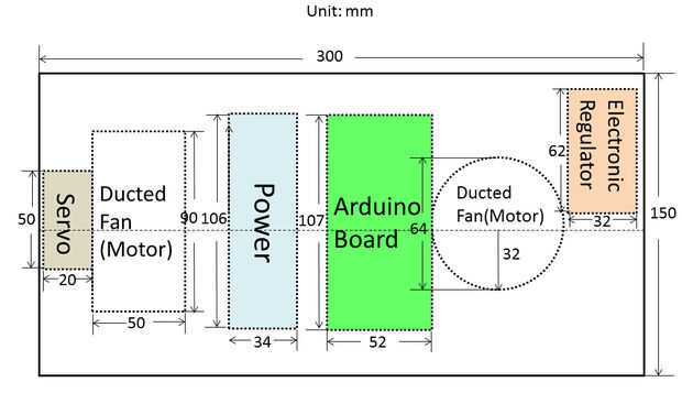 - Componentes: dos 64 mm conductos ventiladores dos reguladores electrónicos (QF 4800KV 2627), (Skywalker-40A) soldados con enchufes en T un servo metálico, una placa Arduino, un controlador de juegos de Sony PlayStation2(PS2), un receptor, batería de litio uno 11.1V (2200mAh 30 C, 106 mm * 34 mm * 23 m m)