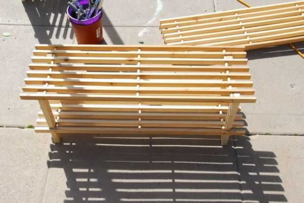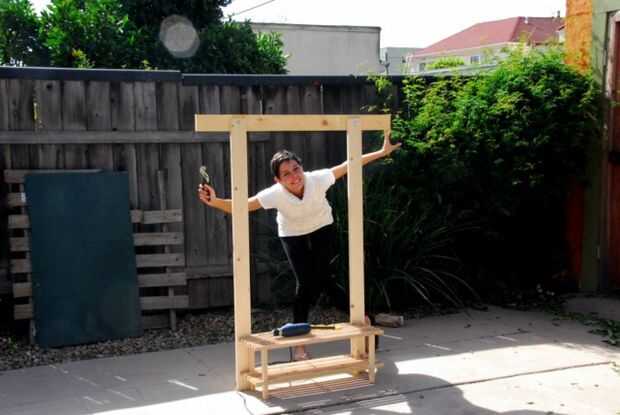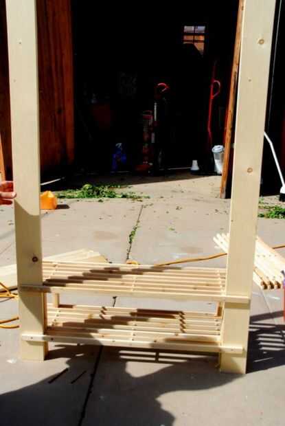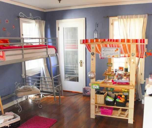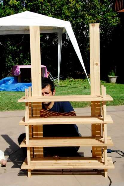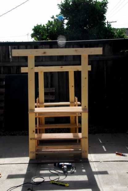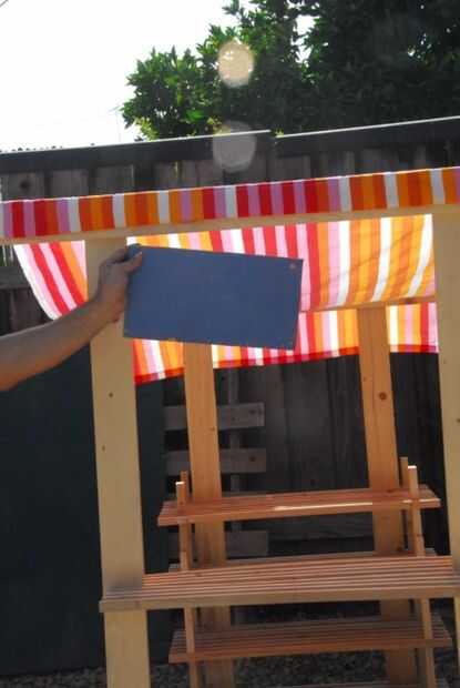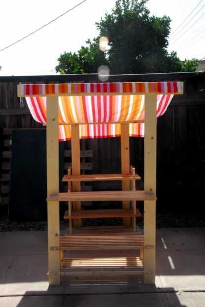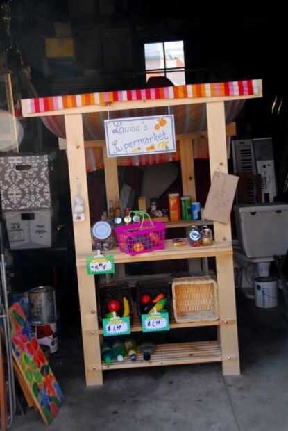 Así que decidimos tomar esto en nuestras propias manos y compró 3 IKEA Babord zapateros, $9,99, un par de 2x4s, algo de tela y accesorios varios (cestas, frutas de plástico, miniatura de latas y botellas,...).