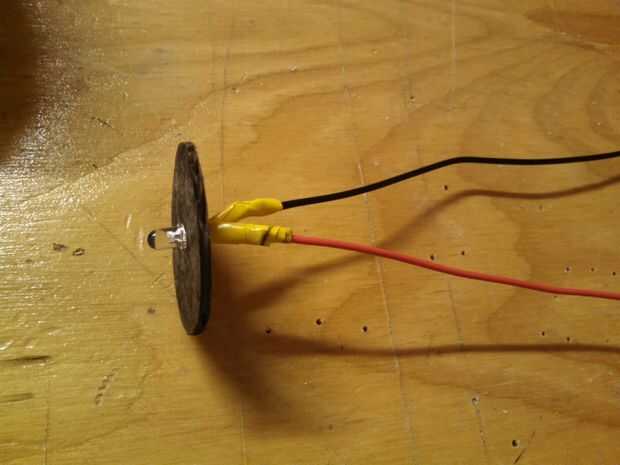 - Cable positivo final (un poco más largo) del LED al cable rojo. Asegurar la conexión con cinta aislante, luego el lado negativo del alambre al cable negro.