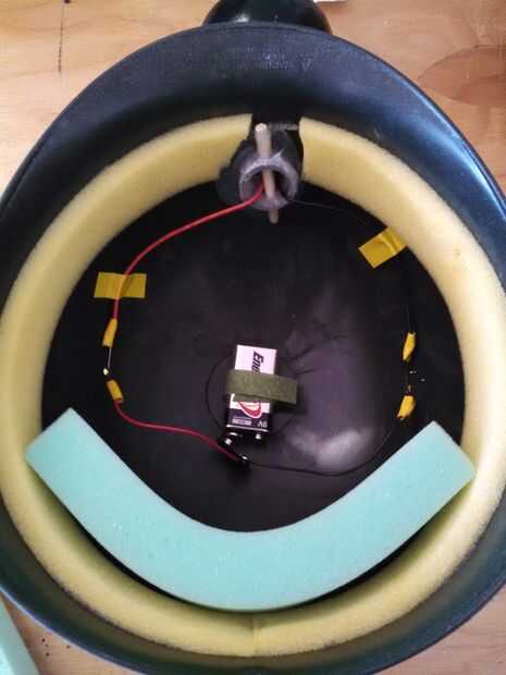 - Los diodos amarillos a través de los orificios del casco del hilo de rosca. Doblar los cables planos contra el casco debe mantener la luz en su lugar, pero usted puede cinta hacia abajo si es necesario.