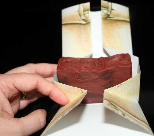 Ahora tome la barra de jabón y coloque en los pliegues que acaba de hacer a cabo. Verifique que no hay demasiado espacio vacío en los extremos de su jabón. Si es así, usted necesitará recortar el papel un poco más para encajar correctamente. Si lo hace, asegúrese de ajustar su impresión en el software para acomodar los cambios.