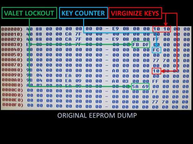 Aquí es un desglose de un dump de la EEPROM. Después de mucha experimentación, se observó que hay tres claves distintas. Cada clave es un valor hexadecimal de 8 dígitos, repetido tres veces. Se divide en dos grupos de cuatro, pero no hay simetría en su posicionamiento dentro de la descarga.