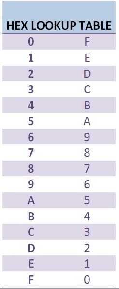 Aquí hay una tabla de búsqueda para invertir HEX. Es prácticamente 0 a F y F a 0 hacia atrás.