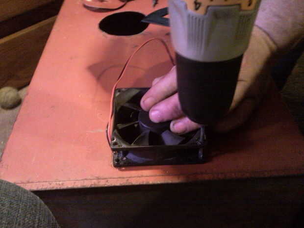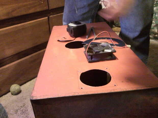 5. corte en 2 orificios a cada lado para los fanáticos y 1 más en la parte superior por una esquina. Asegúrese de centro de los ventiladores en el lado y la parte superior para proporcionar una buena circulación de aire. Tengo 2 entradas y 1 salida en este cuadro.