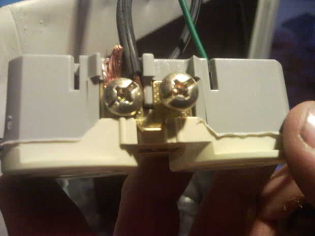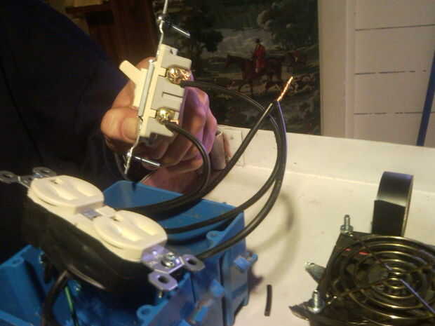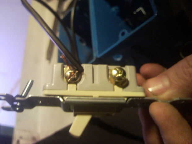 11. conectar el cable vivo del puente hacia el lado off del interruptor. Conecte el cable de la toma de luz para en el lado del interruptor. El interruptor de cinta con cinta aislante negra y está conectado.
