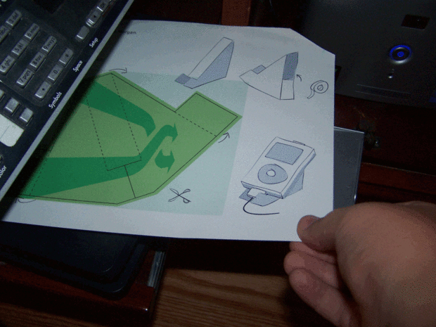Usando cualquier archivo en la parte inferior de este paso, inserte su tarjeta [lo que] en la impresora e imprimir el archivo. El archivo personalizado es un soporte en blanco, mientras que el otro tiene un iPod shuffle diseño flecha en él.