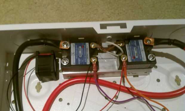 Conecte el SSRs o contactor hasta el tablero de regulador EVSE. (Supongo que usted sabe que + positivo, - es negativo, y ~ significa voltaje de CA.)