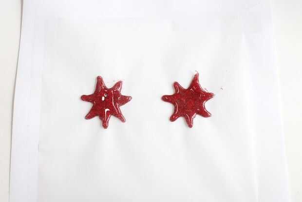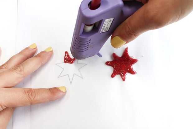 Cuando la pistola encoladora esté lista, empezar a trazar las formas de estrellas. Hice a un combo de trazar la línea exterior y el relleno en el centro. Dejar reposar un segundo y llene adentro cualquier boquete para hacer la parte superior de la superficie como incluso como sea posible. Está bien salir de las líneas, la forma se limpiarán para arriba más adelante.