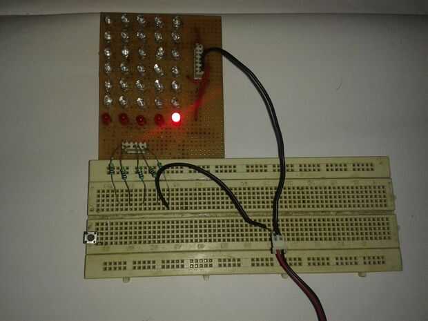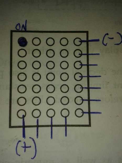 Primero para activar el indicador luminoso en el tablero dar entrada positiva al primer pin del columna pin set y aporte negativo al primer pin del fila pin set. El primer LED empieza resplandor, además de probar todos los LED en el tablero. Según el carácter que desee en tablero encienda el LED correspondiente.