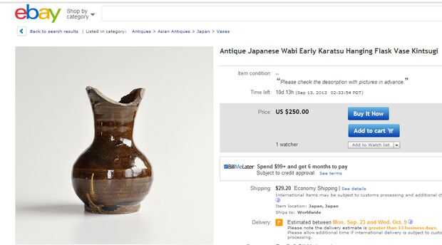 Usted puede encontrar piezas Kintsugi en subastas. Es muy costoso, como las reparaciones se realizan generalmente en oro real y por artesanos cuyo talento mío superan con creces. Así, mientras vamos a hacer nuestras propias piezas Kintsugi, vamos a estar haciendo en el barato. En Ebay, esta hermosa pieza Kintsugi va de $250. Tanto como me gustaría poseerlo, es un poco más allá de mis posibilidades.