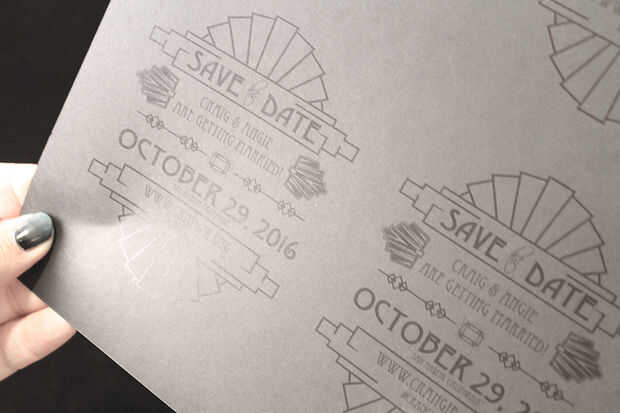 Una vez que tenga un diseño que te gusta, tienes que imprimir la imagen sobre la cartulina o el papel con un chorro de láser. Por cualquier motivo, la hoja de oro se adhiere a la tinta de un chorro de láser, pero no una de inyección de tinta. Si usted es como yo y no posee una impresora láser jet, puede enviar su diseño final a una impresora... O hacer lo que hice, que es mucho más económico - y su diseño final en el papel de fotocopia. Esta opción sólo me costó $0,13 USD por página para imprimir. Por 8.5 "x 11" página, pude imprimir 4 invitaciones y 3 plantillas de envolvente.