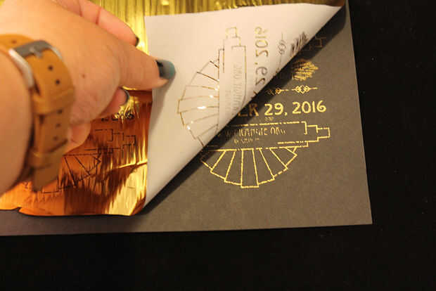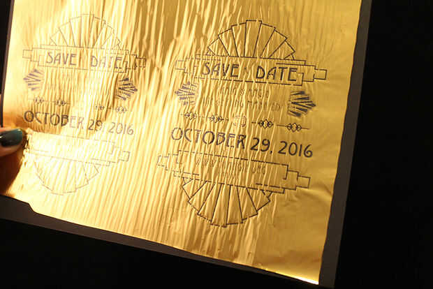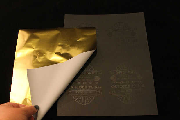 Corte suficiente hoja de oro para cubrir su diseño. Coloque la parte trasera de la hoja hacia abajo en la parte superior la página impresa, con el oro hacia arriba. Ejecutar a través de un laminador en caliente según las instrucciones de su máquina. (si su máquina no viene con una carpeta para poner su trabajo a, sólo intermedia la hoja de oro entre dos pedazos de cartulina. Lo que quiere evitar es atraviesa la lámina de oro y permitiendo el contacto directo con la laminadora).