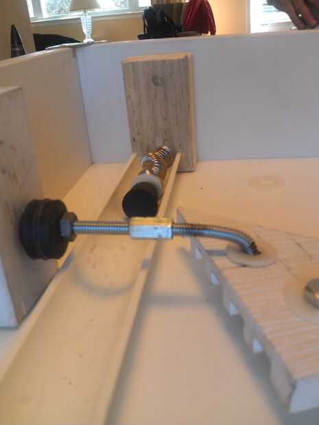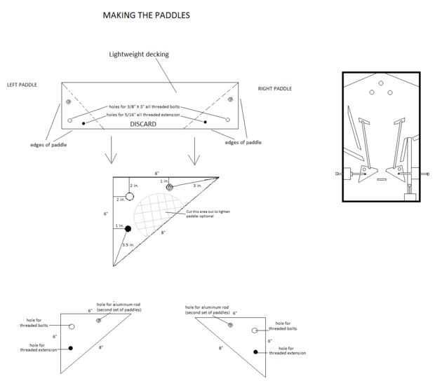 3. Taladre orificios de 1/4" para la barra en cada paleta (más grande) más bajo, indicado por la foto.