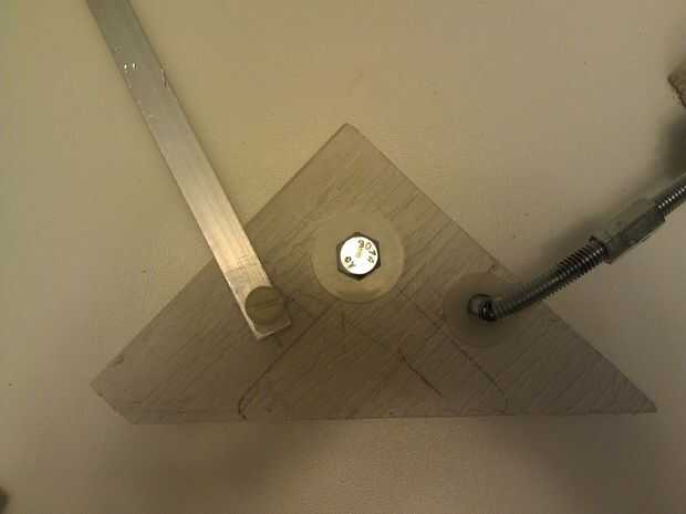 1. corte un triángulo de las directrices de la foto incluida. Recuerda hacer los agujeros un poco más grandes que los tornillos para eliminar la fricción. Las paletas del triángulo final deben medir aproximadamente 6"(lado) x 6" (lado) x 8"(diagonal).