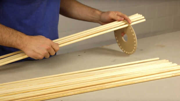 Ahora coloque el anillo 2 entre los maderos redondos a una distancia de 20cm desde abajo. Las maderas se pueden pegar para el anillo inferior o, como se ve en el vídeo, puede sujetarse con un anillo de goma con estilo.