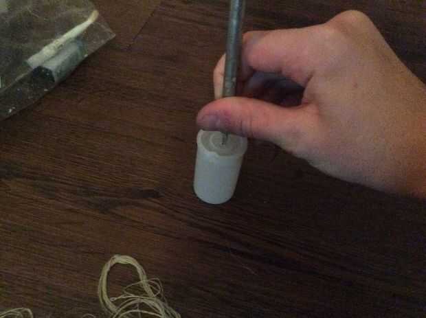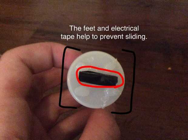 Comience usando una hoja de las tijeras (o un cuchillo Xacto) para perforar la tapa de la lata de película. El agujero debe ser lo suficientemente grande como para permitir que los cables pasan a través. Después de se hace enchufa la pistola de pegamento caliente. Cuando se calienta la pistola de pegamento, poner cuatro puntos de cola, todo en forma de caja, en la parte inferior de la lata. Los globos deben ser bastante grandes y deben ser la misma altura. Los globos actuarán como pies y dejarán el aparato de deslizamiento. Para asegurar que el dispositivo se mantiene en cualquier superficie lo mantienes encima, puede doblar algunos cinta aislante en una almohada y palillo entre los pies.