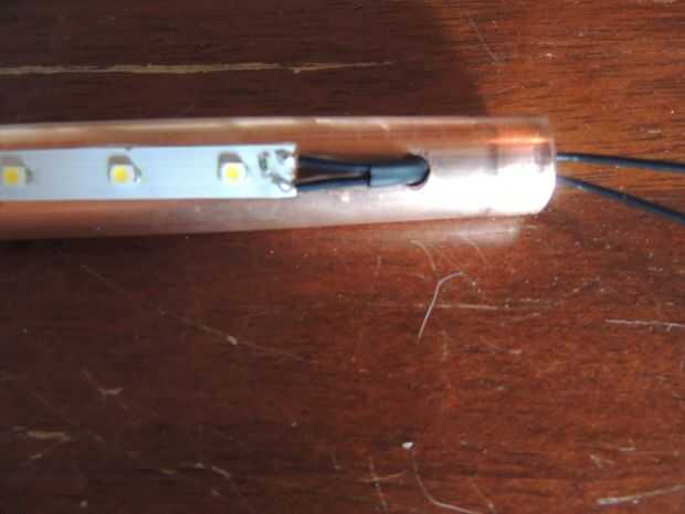 5. Ahora puede pasar los alambres a través de todo el que ha perforado y pegar la tira del LED (superior e inferior izquierda imágenes) (corte a la longitud más cercana a la tubería) a la tubería con forro adhesivo. (Casi todas las tiras de LED tienen esto. Si no, algún tipo de pegamento estará en orden.)