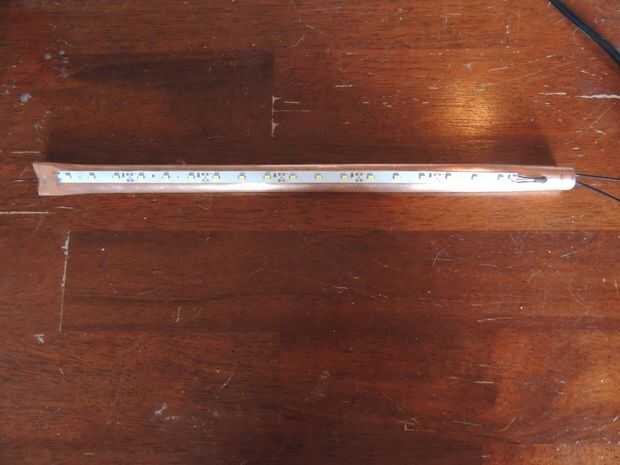 4. Aplicar un aislante de algún tipo entre el tubo de cobre y la tira de LED. Usé cinta aislante. La tira LED está aislada probablemente ya, pero los materiales altamente conductores que utiliza este proyecto me hizo querer ser prudente.