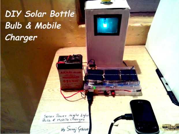 BRICOLAJE Solar basado en bulbo y móvil cargador proyecto utiliza paneles solares, un circuito que convierten el voltaje del panel solar para cargar la batería recargable, alta potencia de 1 vatio led luz colocada en botella de plástico y circuito de carga móvil para cargar el teléfono móvil vía cable USB.