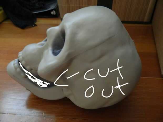 A continuación tome su exacto o una cuchilla y cuidadosamente corte un agujero redondo en la mandíbula inferior lo suficientemente grande para una vela llevada a través de la prensa. Tenga cuidado de no cortar el agujero demasiado grande.