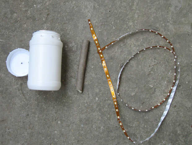 Aquí están las piezas que necesita: recipiente de plástico, palo de madera, alambre y cinta de LED. La cinta de LED es seld-adhesivo, usted puede comprar en Ebay o cualquier tienda de electrónica. En mi caso usé medio metro V-tac 3528 que costó $0,80