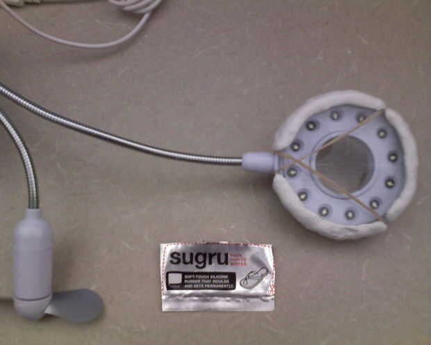 Para una solución más permanente que decidí usar Sugru para colocar la lupa a la lámpara. ¿Por qué Sugru? Yo sólo quería ver si realmente funcionaría y, además, mi Sugru estaba más allá de su fecha de caducidad así que, realmente necesitaba encontrar un uso para él. Pude restaurar dos de los paquetes y tomó un montón de amasado para que vuelva a su consistencia original. Por desgracia el tercer paquete no pudo ser restaurado sin importar cuánto amasado probé y terminó como masa se secó. No, no es muy bonita pero la sugru parece sostener la lupa a la luz bastante bien.