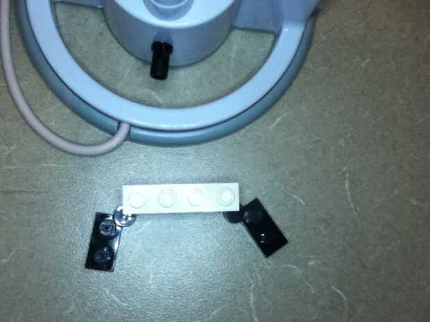 1 de 2 por 4 placas de bisagra superior giratorio y 1 por 4 ladrillos Technic con agujeros y acóplelos. Complemento de estos en la técnica del perno en la base de la lámpara. Obtener un 1 segundo por 4 ladrillos Technic con agujeros y ajustar a la parte inferior de las piezas de la bisagra.