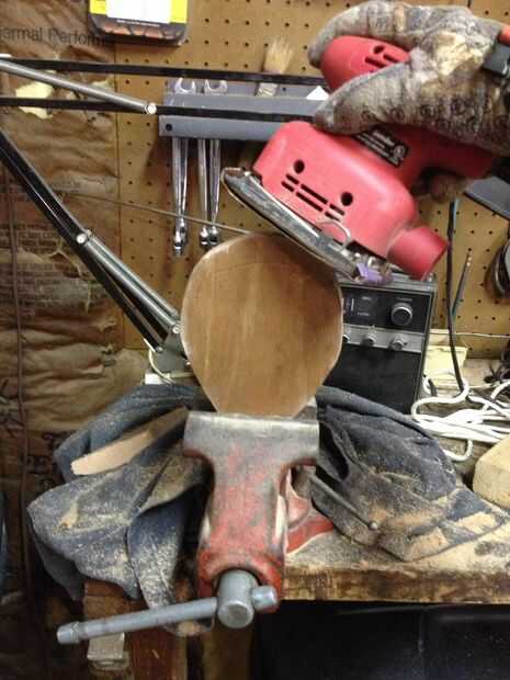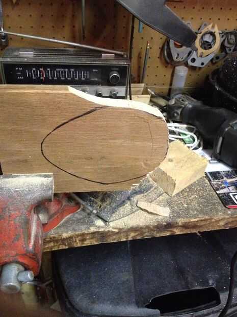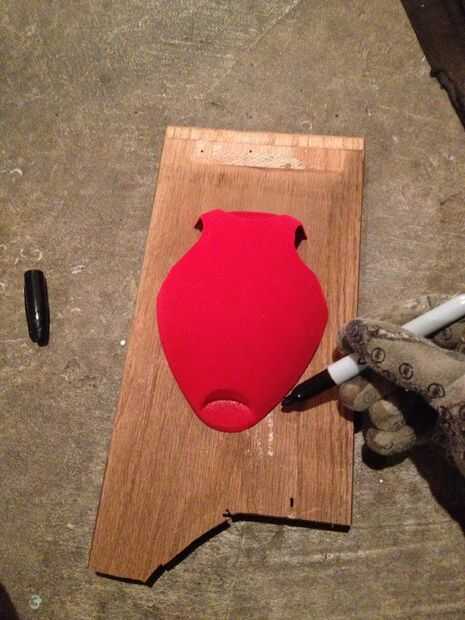 Dibujar una forma de lágrima en la pieza de madera de desecho que utiliza para la base. Utilicé una tapa de una placa barata asta kit de montaje para hacer mi forma. No tienen que ser exactos. Una vez que el cuero se pone encendido más adelante en el proceso, no podrás saber si no es perfecto.