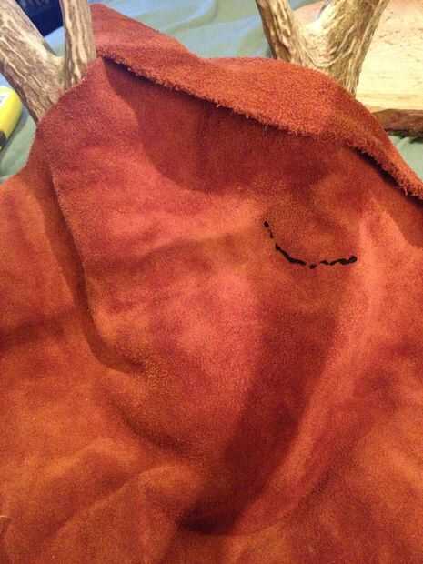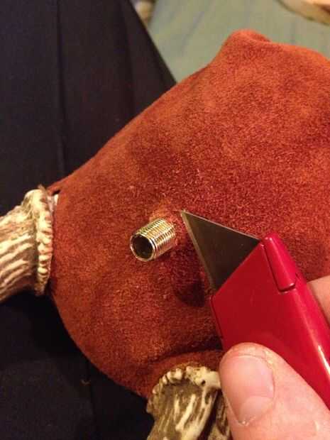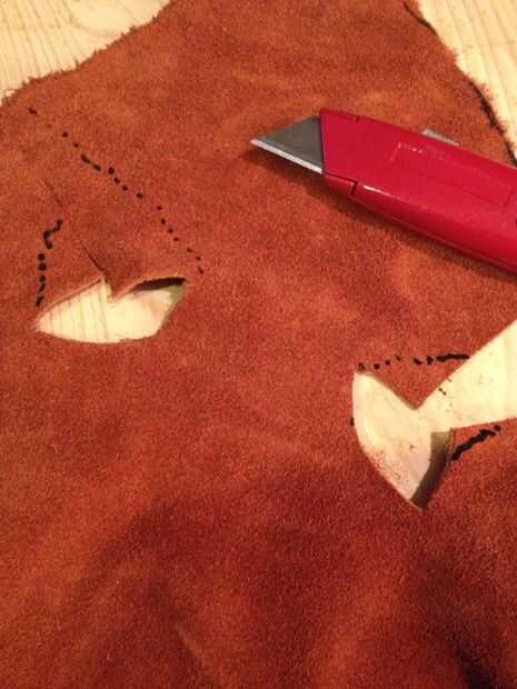 Consejo: Una vez que la huella fue hecha en el ante, sacó la navaja de utilidad (hoja de afeitar) el cuchillo sí mismo. Era mucho más fácil cortar este orificio precisamente manteniendo la hoja de afeitar, más bien que el cuchillo entero.