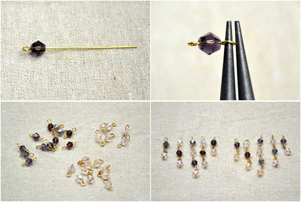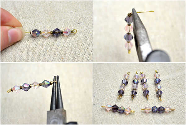 2 º, del mismo modo, tomar un eyepin, como granos de cadena: un grano de cristal púrpura de 6mm, una bola de 6mm cristal rosa, una bola de cristal púrpura de 6mm y una bola de 6mm cristal rosa. Mantener perno de 6mm en el extremo y haz simple mediante el uso de pinzas de la misma manera. 2 unidades se requieren;